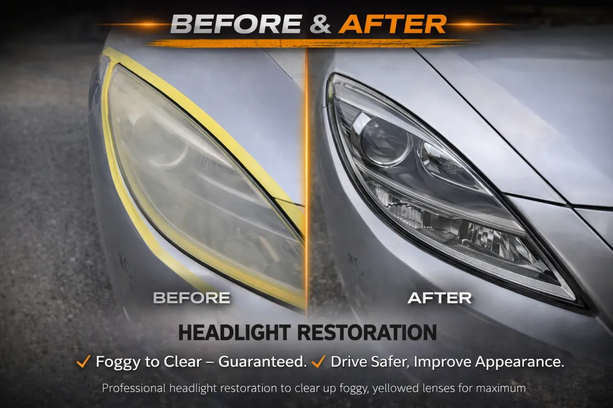 Over time, headlights become cloudy and reduce nighttime visibility. We restore clarity and apply a protective clear coat layer for added durability and longer-lasting results — improving both appearance and safety on the road.